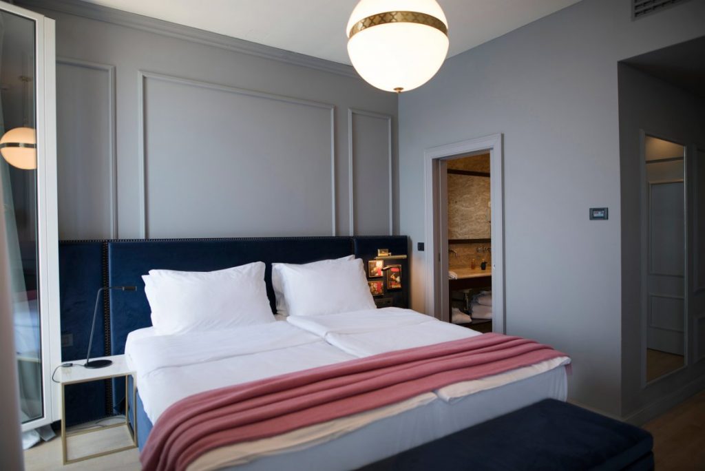 Breathtaking views of both the Old Town and the sweeping Dalmatian coastline greet you from the floor-to-ceiling windows and balcony of our Deluxe suite. It sleeps two and offers an elegant living room with small library, a dining area with panoramic windows onto medieval Dubrovnik, plus two bathrooms. Bespoke furniture, handpicked objets d’art and original art works by famed local artists underline a sense of exclusivity.